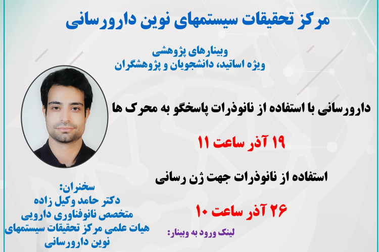 وبینارهای پژوهشی ویژه اساتید، دانشجویان و پژوهشگران با سخنرانی دکتر حامد وکیل زاده عضو هیات علمی مرکز تحقیقات سیستمهای نوین دارورسانی